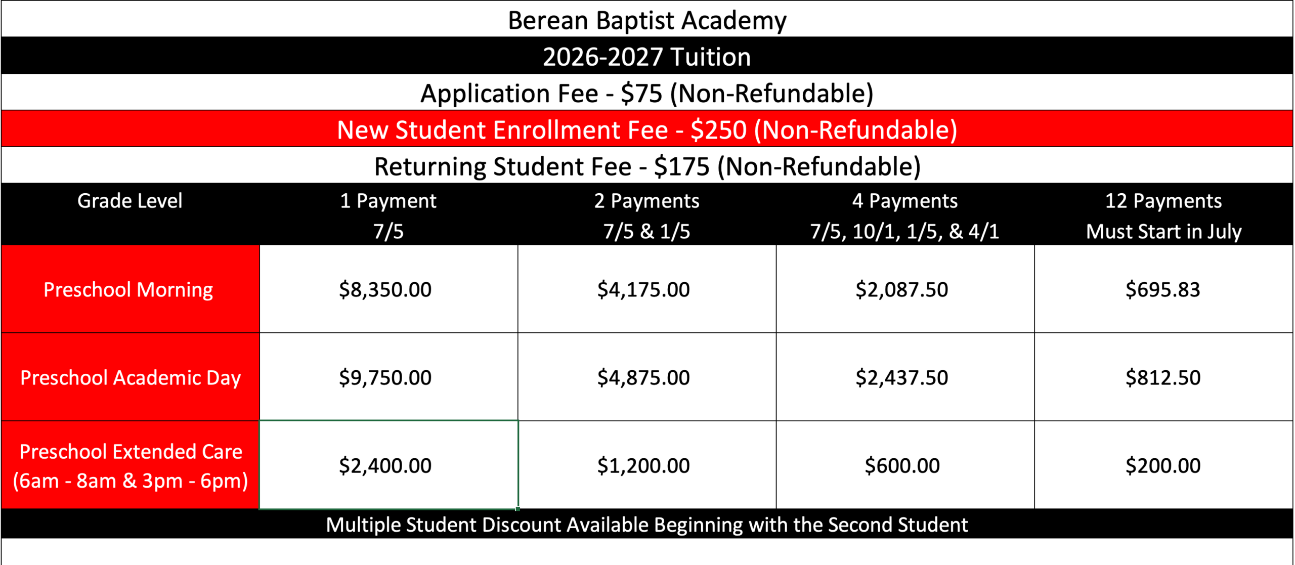 The Financial Information On This Page Reflects The 2026-2027 School Year – Please Contact Admissions or Finance at (910) 868-2511 for Current Rates